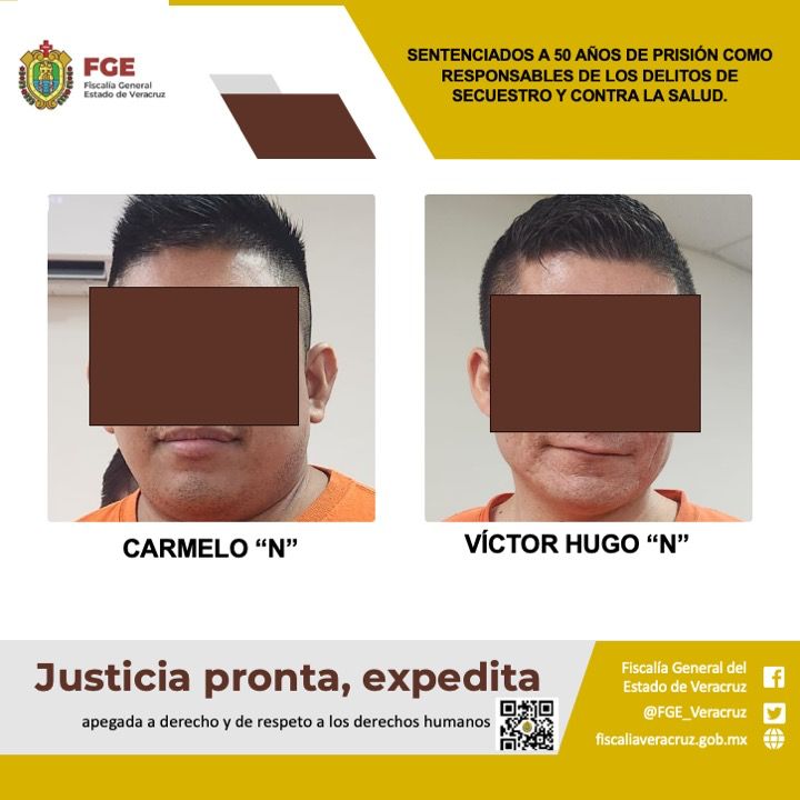 Poza Rica, Veracruz | El día de ayer la Fiscalía General del Estado, a través de la Fiscalía Regional Tuxpan, logró sentencia condenatoria de 50 años y 10 meses de prisión en contra de Carmelo “N” y Víctor Hugo “N”, quienes fueron encontrados responsables de los delitos de secuestro y contra la salud.