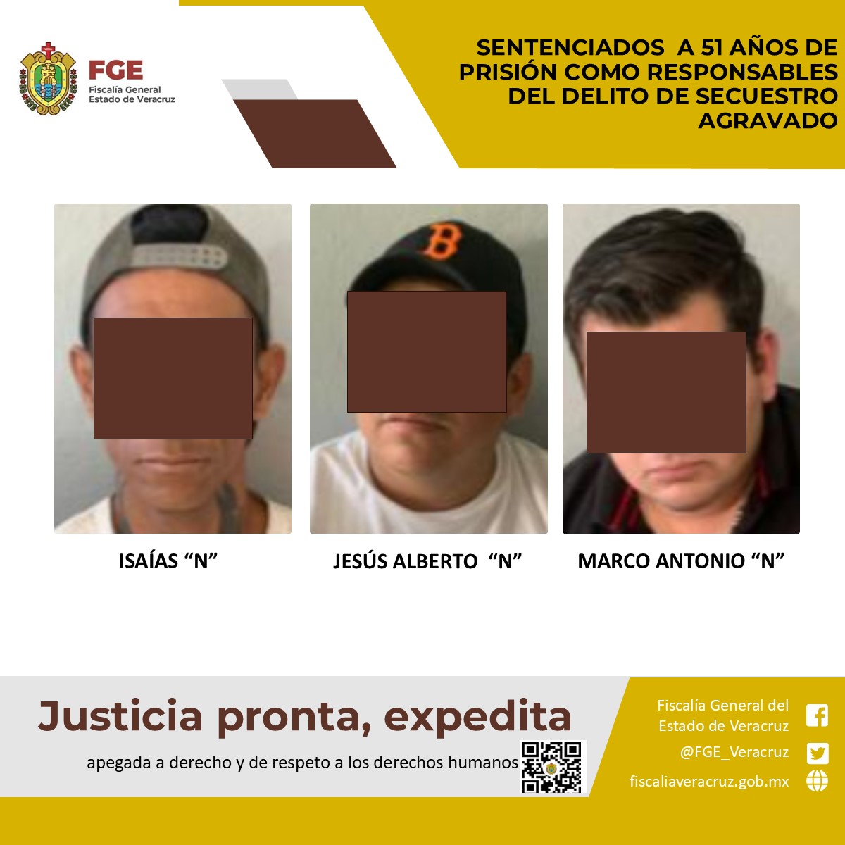 Xalapa, Veracruz | Esta mañana, la Fiscalía General del Estado informó que a través de la Unidad Especializada en Combate al Secuestro fue obtenida la sentencia condenatoria de 51 años de prisión en contra de Jesús Alberto “N”, Isaías “N” y Marco Antonio “N”, quienes fueron encontrados responsables del delito de secuestro agravado, cometido en agravio de la víctima A.D.M.L.