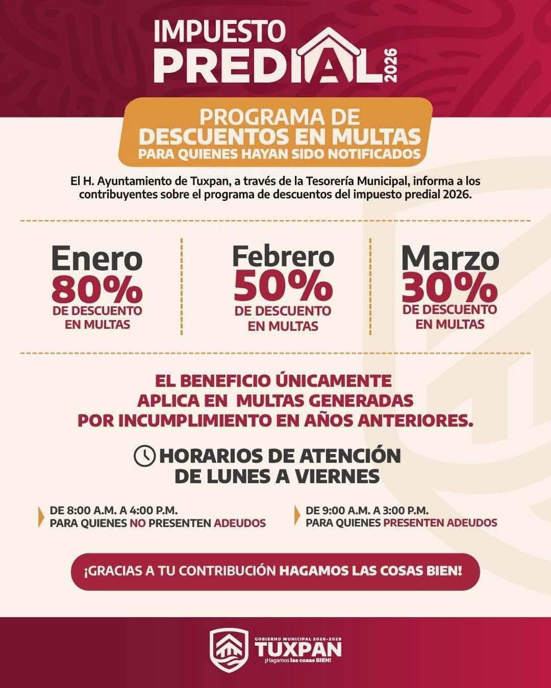 El Ayuntamiento de Tuxpan invita a la ciudadanía a aprovechar estos descuentos, cumplir de manera oportuna con sus contribuciones y seguir sumando al bienestar y desarrollo de nuestro municipio.