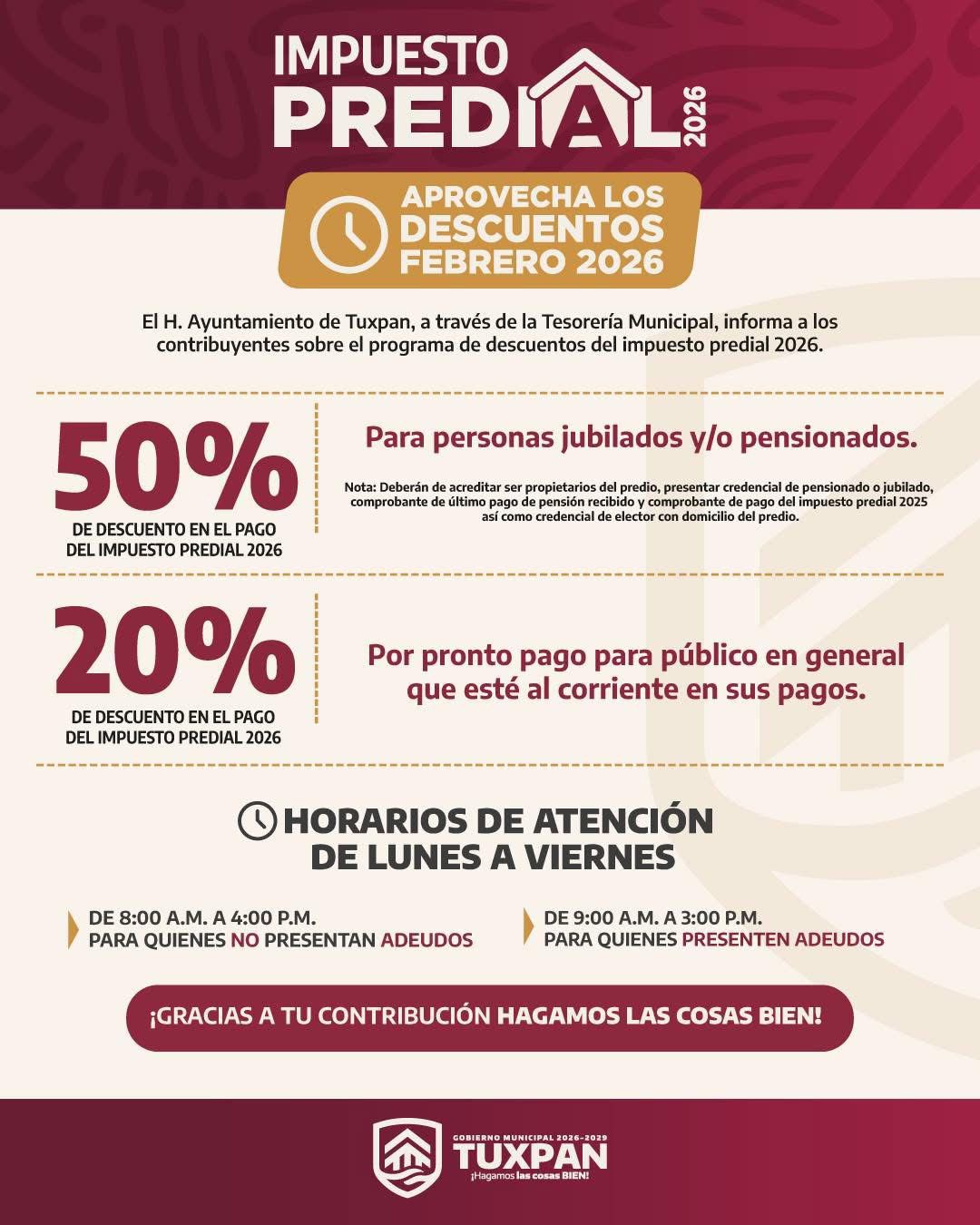 Comunicado de Prensa del Ayuntamiento de Tuxpan, Veracruz a 9 de febrero de 2026.- El H. Ayuntamiento de Tuxpan, a través de la Tesorería Municipal, informa a la ciudadanía que durante el mes de febrero se encuentra vigente el 50% de descuento en el pago del Impuesto Predial 2026 para personas jubiladas y/o pensionadas, como parte de las acciones implementadas para apoyar la economía familiar.