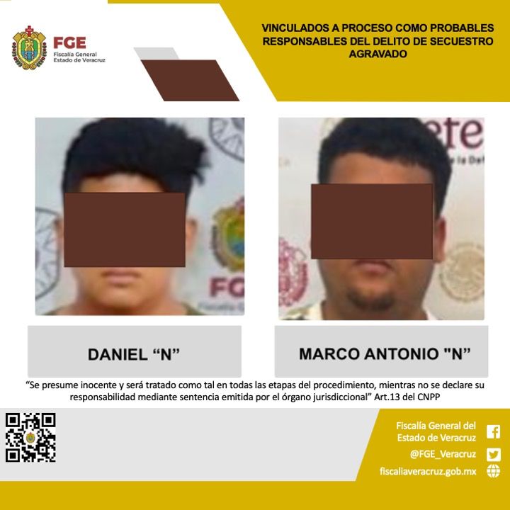 Papantla, Veracruz | La Fiscalía General del Estado, a través de la Unidad Especializada en Combate al Secuestro con sede en Tuxpan, obtuvo la vinculación a proceso en contra de Daniel “N” y Marco Antonio «N” como probables responsables del delito de secuestro agravado, cometido en agravio de las víctimas identificadas con las iniciales C.H.M., y C.A.R.F.