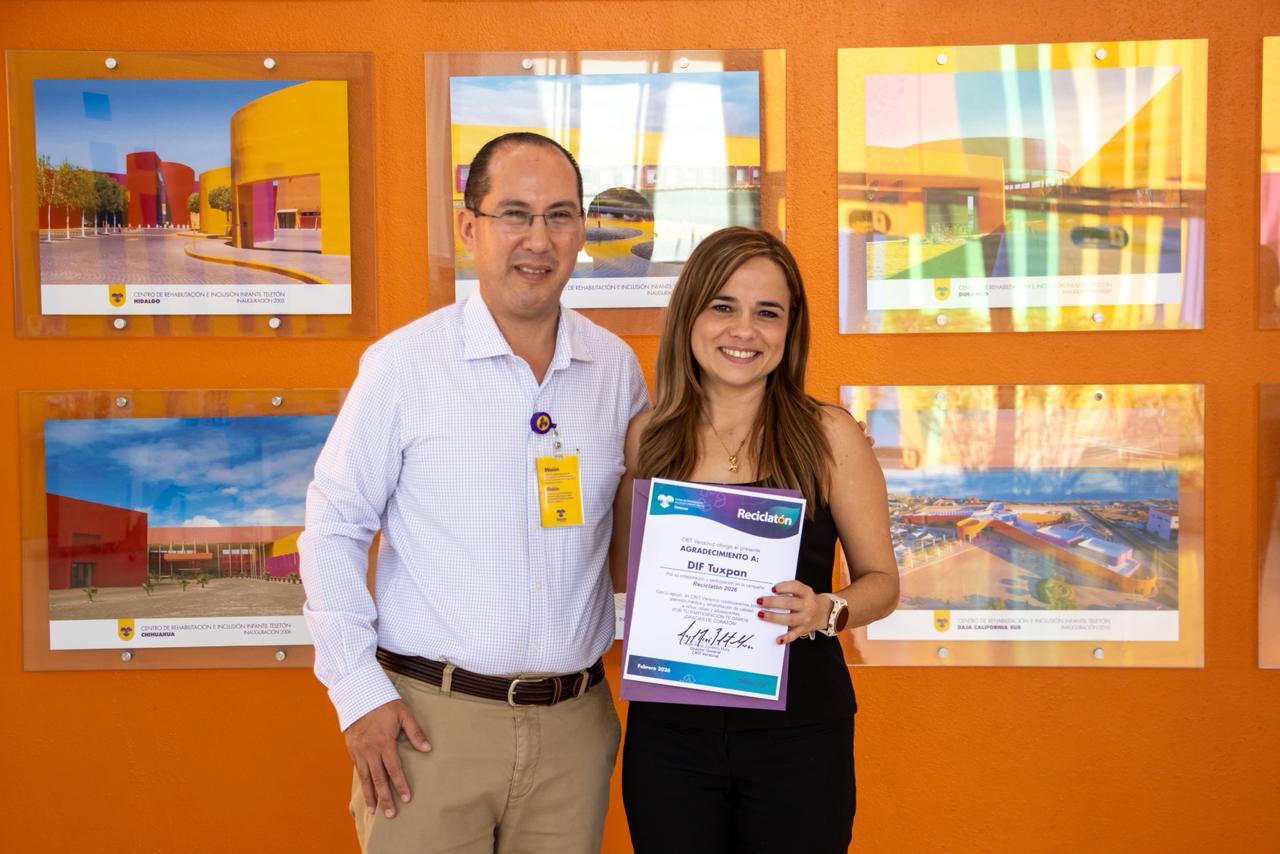 A nombre del CRIT Veracruz, Zavaleta Mora entregó un agradecimiento a DIF Tuxpan por su colaboración y participación en la campaña “Reciclatón 2026”, que permitirá brindar atención medica y rehabilitación de calidad.