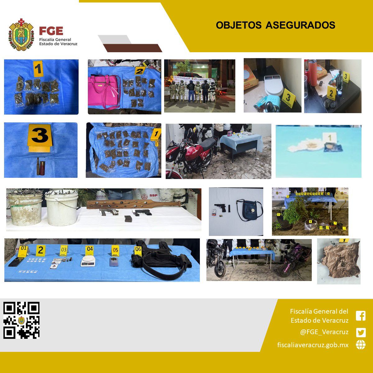 En los municipios de Veracruz, Tierra Blanca, Fortín de las Flores, Coatzacoalcos, Minatitlán, Cosoleacaque, Las Choapas, Tuxpan, Rafael Lucio, Xalapa y Martínez de la Torre, fueron asegurados hierba verde seca con características similares a la marihuana, una sustancia granulada color blanco y material rocoso cristalino con características similares al cristal, teléfonos celulares, básculas grameras, un chaleco táctico, fornituras, casquillos y cartuchos balísticos, identificaciones, vehículos, motocicletas, pipas y otros artefactos para el probable consumo de enervantes, además armas de fuego, cargadores balísticos, objetos metálicos tipo ponchallantas, una tabla de castigo, llaves vehiculares, macetas con plantas con características similares a la marihuana, una culata retráctil y una libreta con anotaciones.