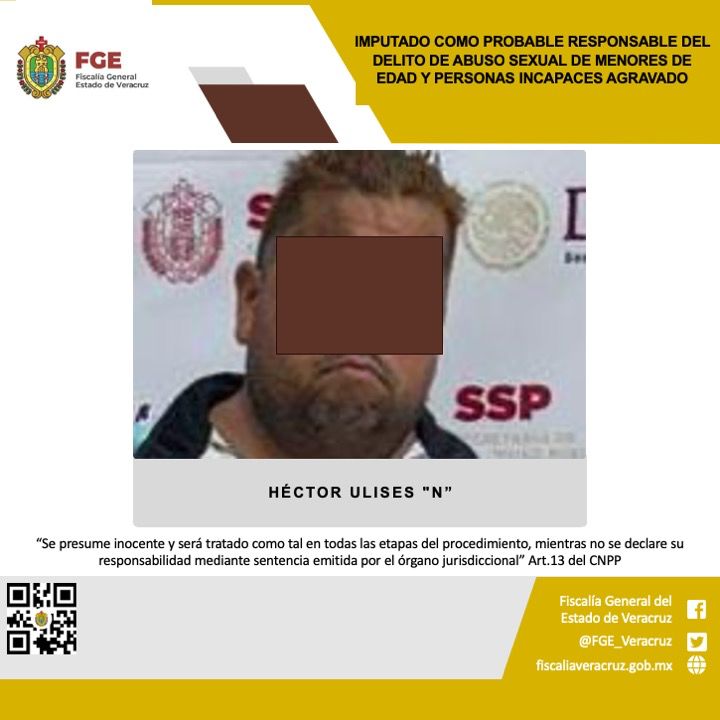 Poza Rica, Veracruz | El día de ayer la Fiscalía Especializada en Investigación de Delitos de Violencia Contra la Familia, Mujeres, Niñas y Niños y de Trata de Personas con sede en el municipio de Poza Rica, obtuvo la imputación en contra de Héctor Ulises «N”, quien es señalado como probable responsable del delito de abuso sexual de menores de edad y personas incapaces agravado, cometido en agravio de una adolescente con identidad resguardada.
