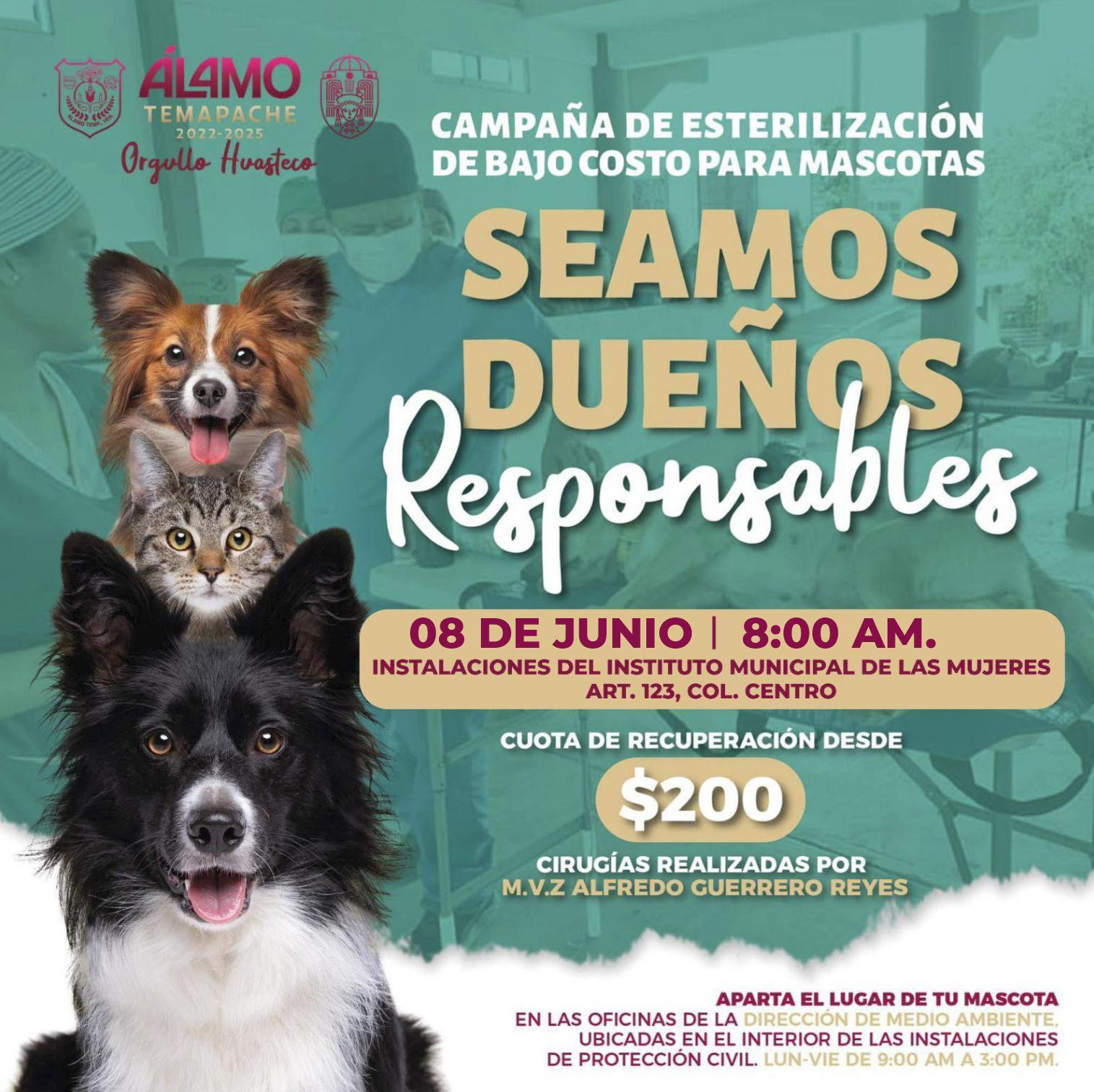 Álamo, Veracruz | Esta mañana comenzó a circular en redes sociales la nueva fecha para la Campaña de Esterilización a bajo costo para Mascotas, esto con la finalidad de continuar apoyando a la economía de las familias alamenses, así como al bienestar animal.