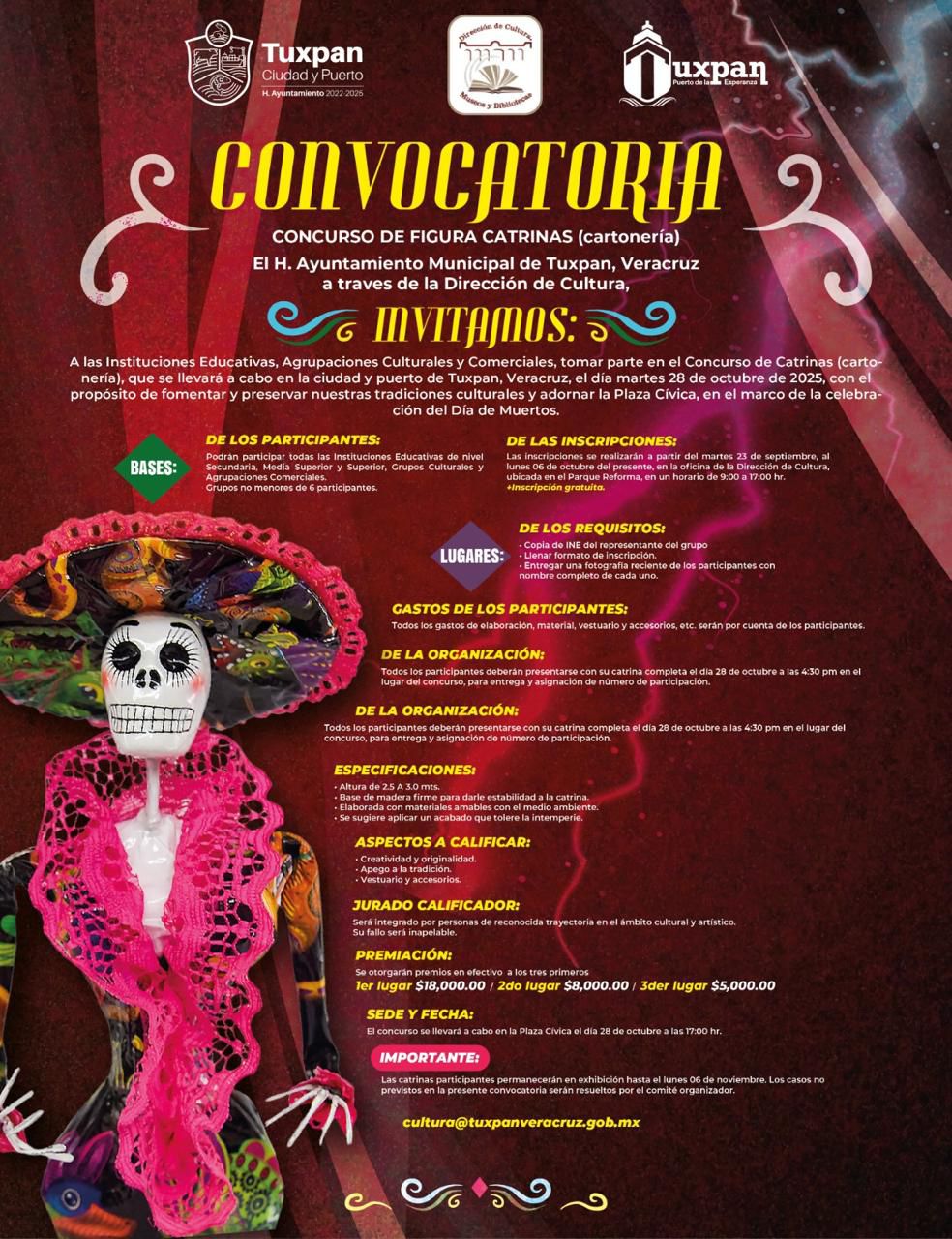 Tuxpan, Ver. – El gobierno de Tuxpan, a través de la Dirección de Cultura, Museos y Bibliotecas invita a la ciudadanía a participar en el Concurso de Figura de Catrinas (de cartón) que se realizará el próximo martes 28 de octubre en la Plaza Cívica, dentro de la festividad de Día de Muertos.