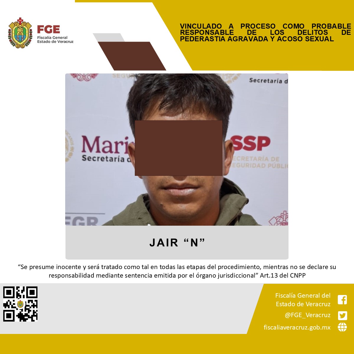 Misantla, Veracruz | Esta mañana la Fiscalía Especializada en Investigación de Delitos de Violencia Contra la Familia, Mujeres, Niñas y Niños y de Trata de Personas obtuvo vinculación a proceso contra de Jair “N”, quien es señalado como probable responsable de los delitos de pederastia agravada y acoso sexual cometido en agravio de la víctima con identidad resguardada.