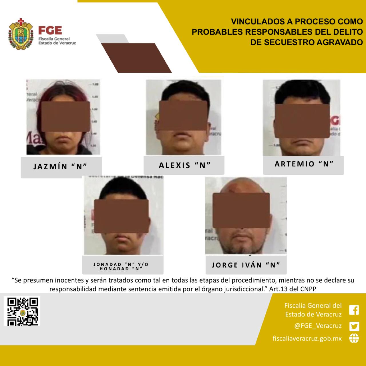 Tlapacoyan, Veracruz | Un juez de control de este distrito judicial emitió vinculación a proceso en contra de Yazmín “N”, Alexis “N”, Artemio “N”, Jonadad “N” y/o Honadad “N” y Jorge Iván “N”, quienes son señalados como probables responsables del delito de secuestro agravado, cometido en agravio de una víctima de identidad resguardada.