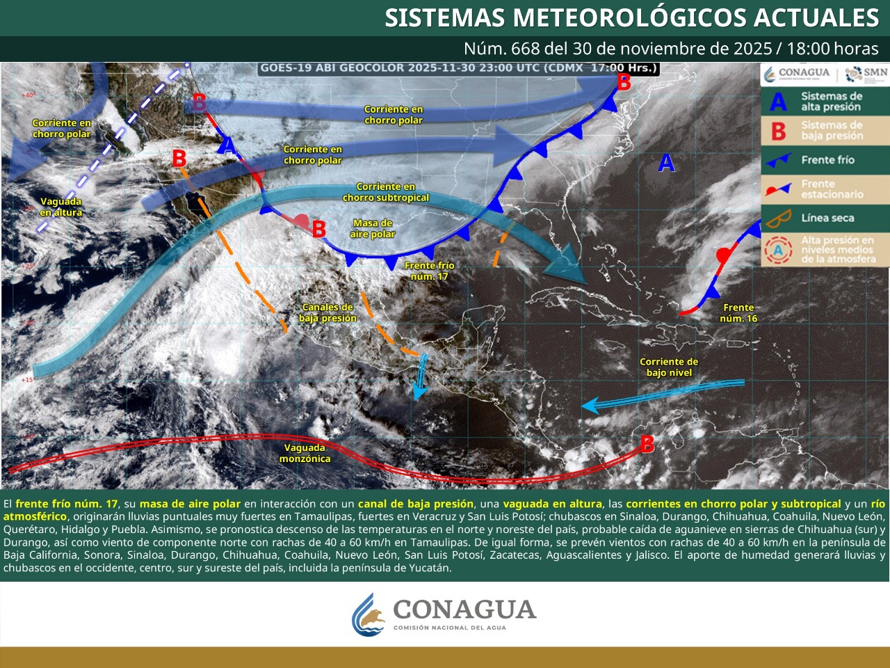 Tuxpan, Ver. 30/11/2025- Durante esta noche y madrugada del lunes, el Frente Frío número 17, impulsado por una masa de aire polar, habrá de provocar lluvias, evento de Norte y moderado descenso de temperatura.