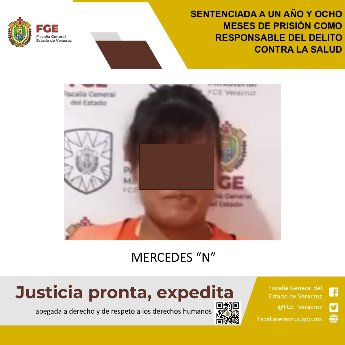 Tantoyuca, Ver., 25 de junio 2025.- La Fiscalía Regional Tantoyuca obtuvo la sentencia condenatoria de un año y ocho meses de prisión en contra de Mercedes “N”, quien fue encontrada responsable de haber cometido delitos contra la salud.