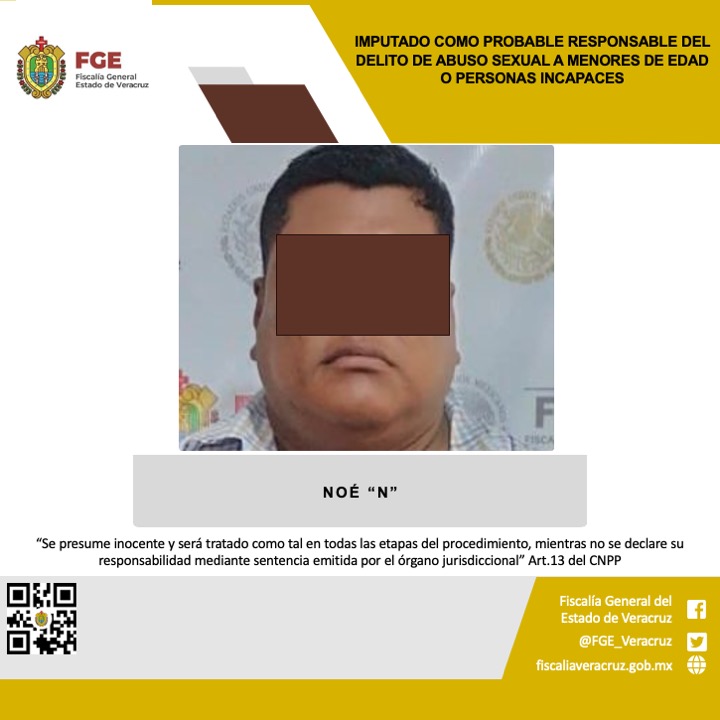 Tlapacoyan, Veracruz | Esta mañana, la Fiscalía Especializada en Investigación de Delitos de Violencia Contra la Familia, Mujeres, Niñas y Niños y de Trata de Personas, obtuvo la imputación en contra de Noé “N”, quien es señalado como probable responsable del delito de abuso sexual a menores de edad o personas incapaces.