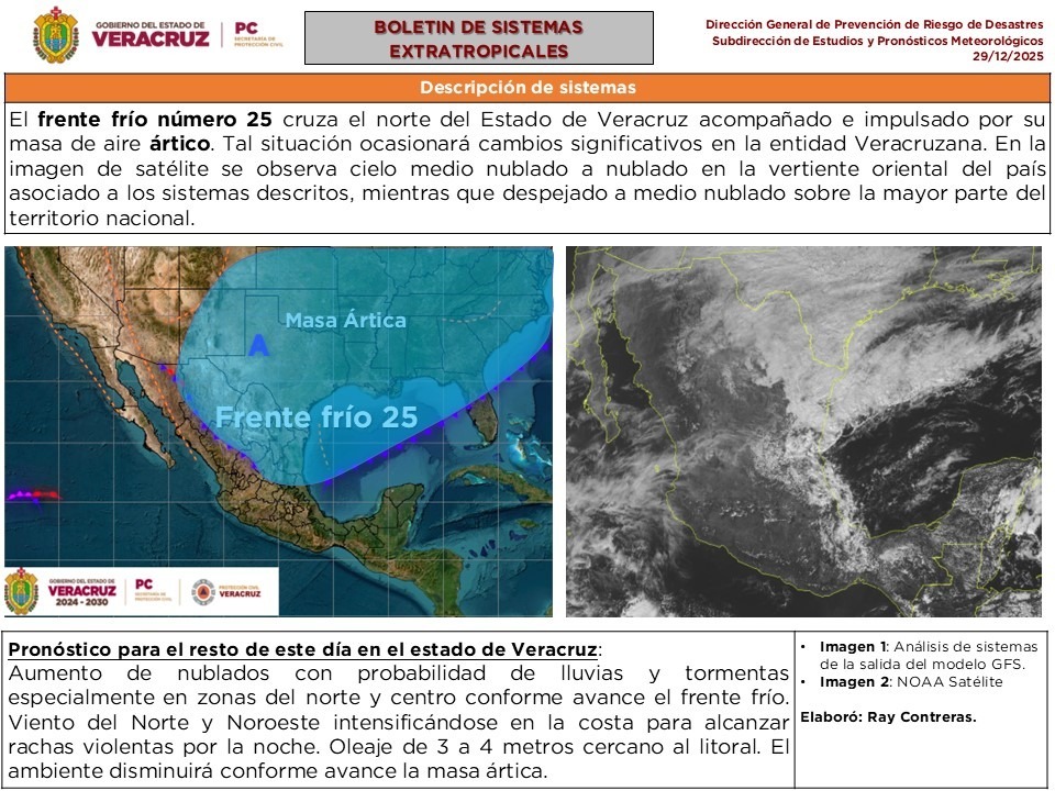 Tuxpan, Veracruz a 29 de diciembre de 2025 | Esta tarde se espera la llegada del Frente Frío 25, que trae “Norte” violento, además de lluvias fuertes y marcado descenso de temperatura.