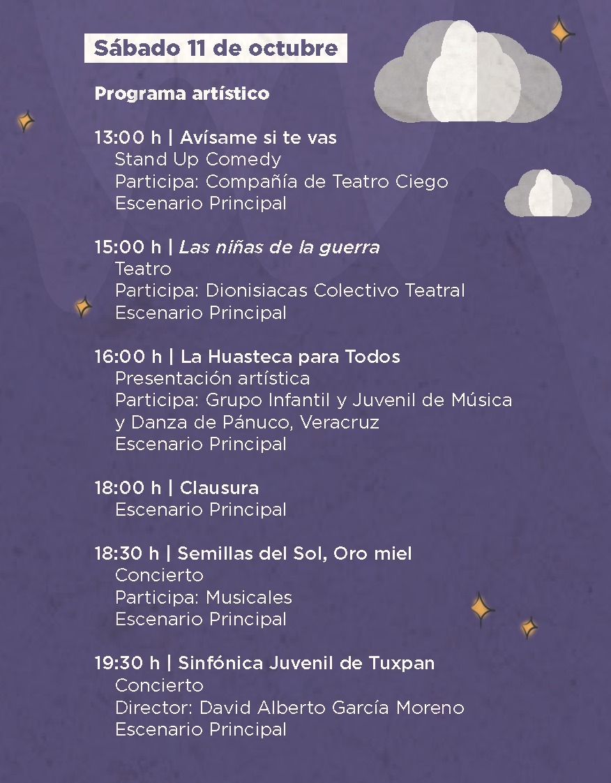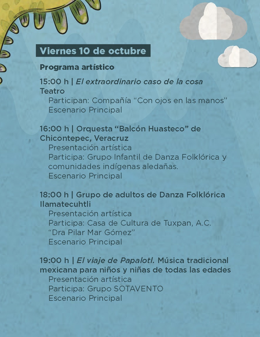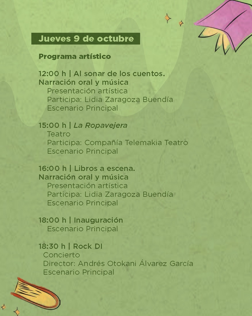 Se desarrollará una amplia gama de actividades artísticas y literarias como narraciones orales, teatro, conciertos, talleres, presentaciones musicales, danza folklórica, presentaciones editoriales, entre otras.
