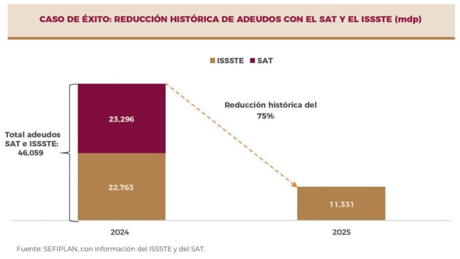 La reducción se alcanzó gracias a una estrategia financiera que permitió liquidar al 100 % el adeudo histórico con la autoridad fiscal, al cubrir totalmente los 30 mil millones de pesos acumulados desde 2009.