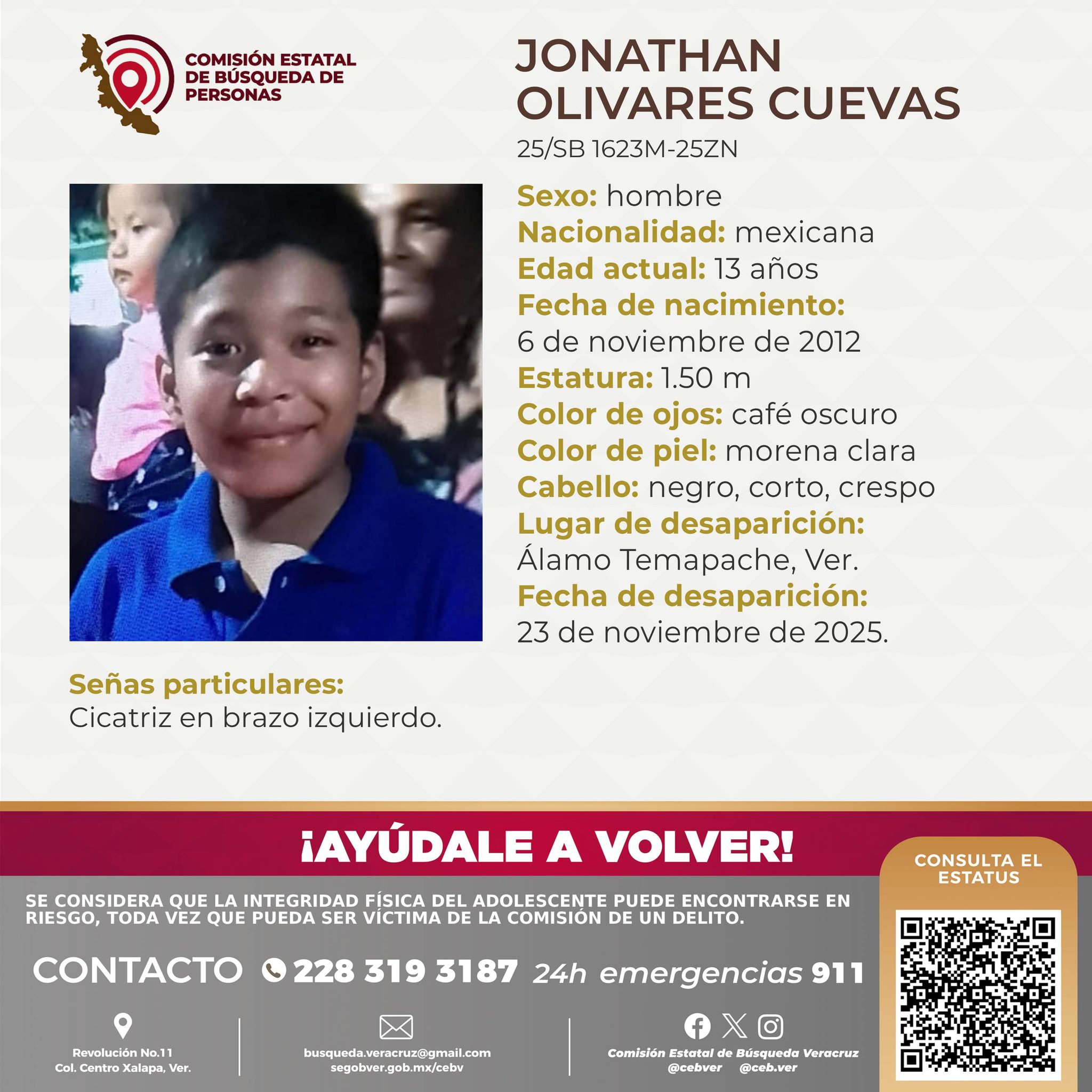 • Jonathan Olivares Cuevas, de 13 años, mide 1.50 metros, es de tez morena clara, ojos cafés oscuros y cabello negro, corto y crespo. Como seña particular, presenta una cicatriz en el brazo izquierdo.