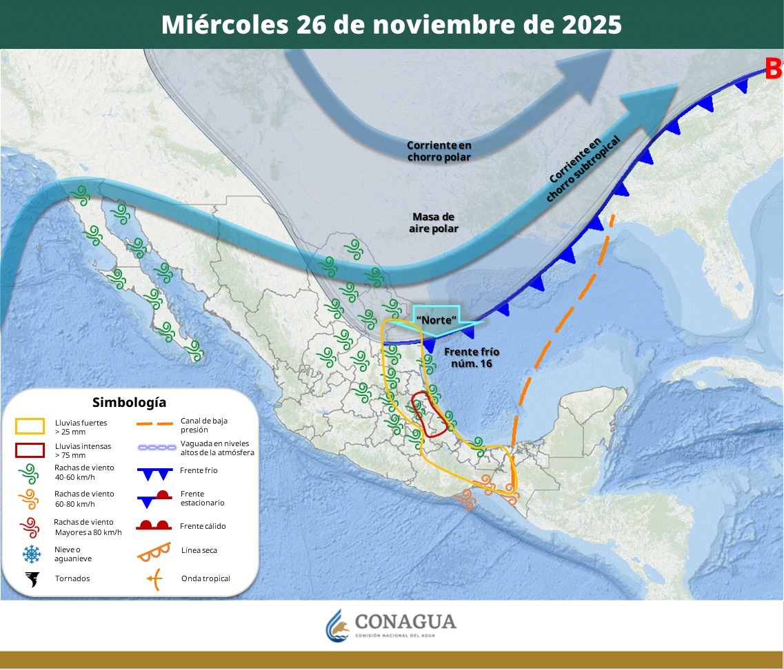 Por su parte, Protección Civil del Gobierno del Estado (Ceec Protección Civil) detalló que el viento será del norte con rachas de 45 a 60 km/h en el litoral, y la línea de cortante anticipará el cambio e intensificación del viento.