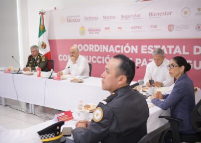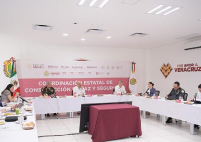 Boca del Río, Ver., a 7 de agosto del 2025.- Esta mañana en las instalaciones del Centro de Control, Comando, Comunicación, Cómputo, Contacto e Inteligencia (C5i), fue realizada la Mesa de Coordinación Estatal de Construcción de Paz y Seguridad, la cual fue encabezada por el Secretario de Gobierno, Ricardo Ahued Bardahuil; y contó con la participación de la Fiscal General del Estado, Verónica Hernández Giadáns; el Secretario de Seguridad Pública, Alfonso Reyes Garcés; la Secretaria de Protección Civil, Guadalupe Osorno Maldonado, así como mandos de Defensa, Guardia Nacional y Secretaría de Marina.