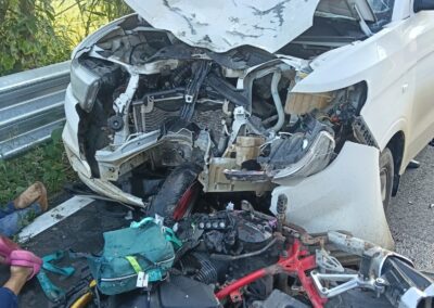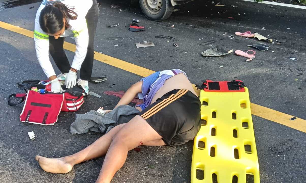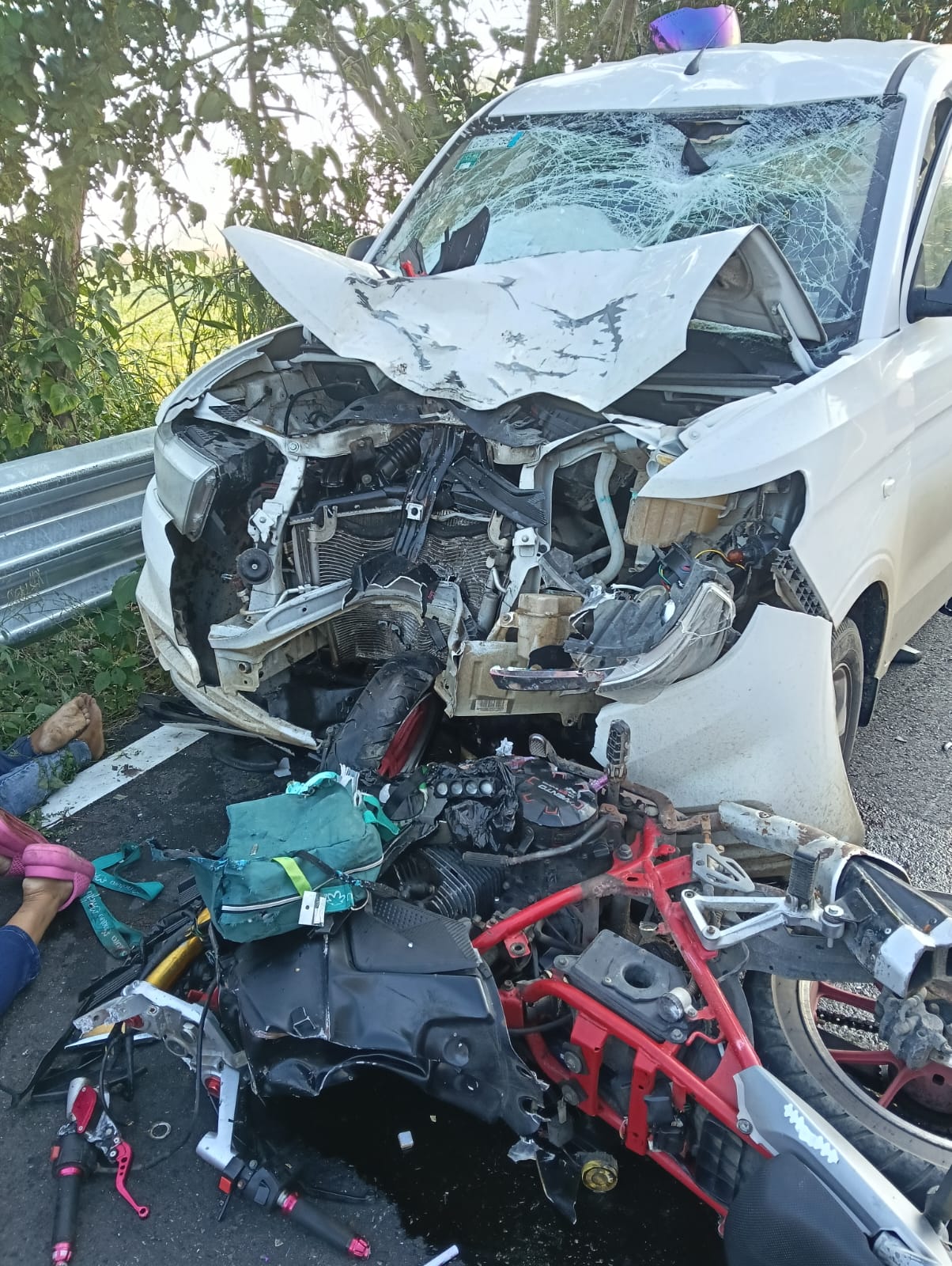 Los hechos ocurrieron alrededor de las 09:00 horas, cuando una pareja que viajaba a bordo de una motocicleta Vento, color negro con rojo, habrían circulado a exceso de velocidad y al invadir el carril contrario, impactaron de frente contra una camioneta Chevrolet Tornado, modelo 2023, color blanco, conducida por María Guadalupe “N”.
