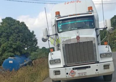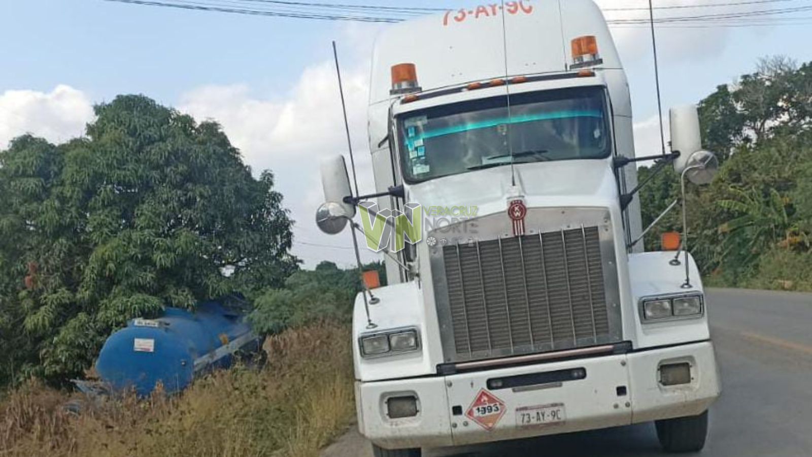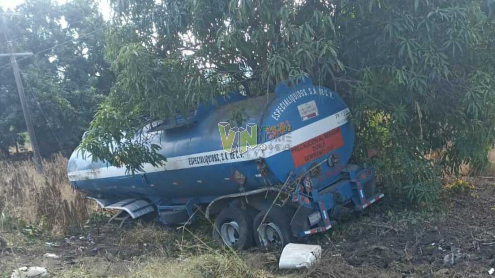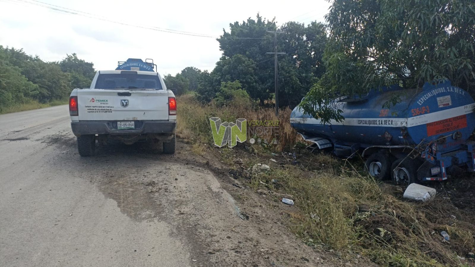 Álamo, Veracruz | Un percance vial se registró el día de hoy sobre el tramo carretero Álamo-Tihuatlán, a la altura de la comunidad El Catorce, cuando la pipa que era remolcada por un tráiler se desprendió y terminó fuera de la cinta asfáltica.