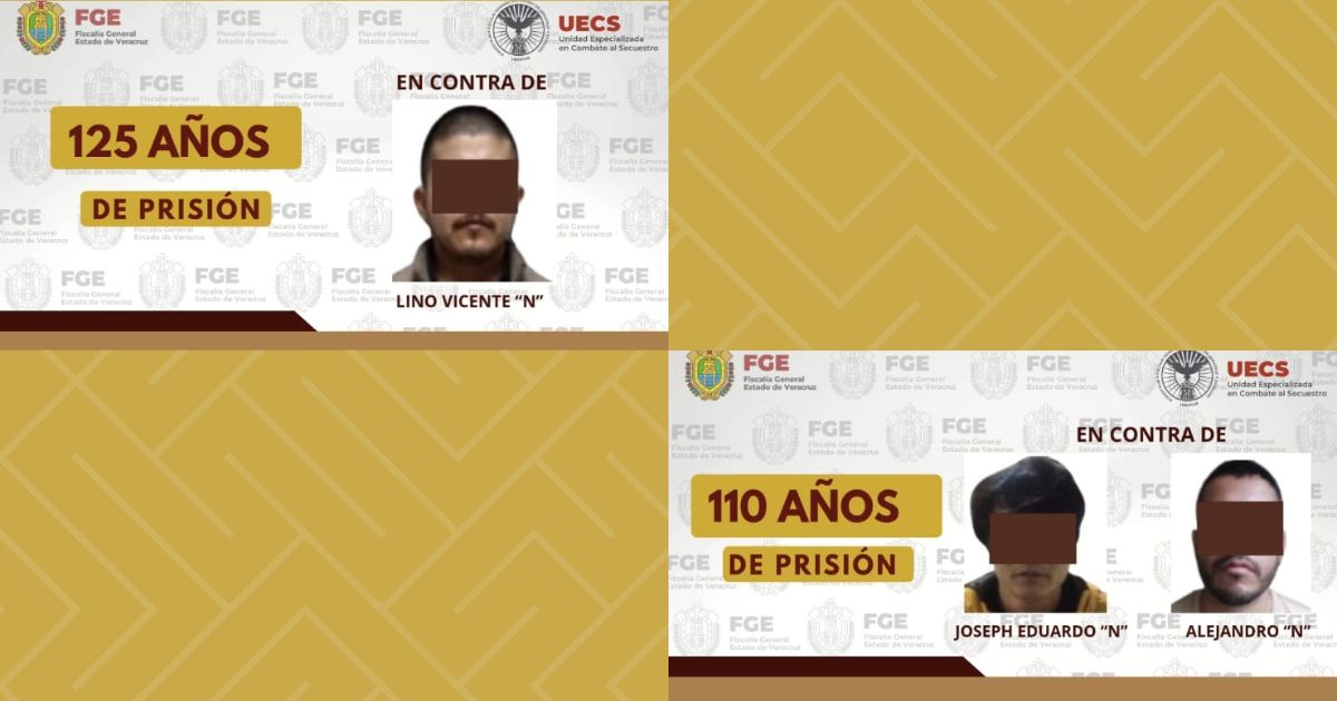 Pánuco, Veracruz | Esta mañana la Unidad Especializada en Combate al Secuestro y la Extorsión con sede en el municipio de Tuxpan, logró una sentencia condenatoria de 125 años de prisión en contra de Lino Vicente “N”, así como de 110 años de prisión en contra de Joseph Eduardo “N” y Alejandro “N”, quienes fueron encontrados responsables del delito de secuestro agravado, cometido en agravio de una víctima de identidad resguardada.