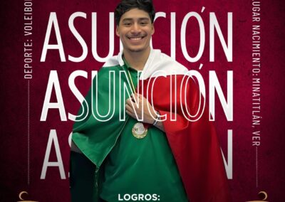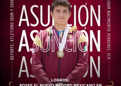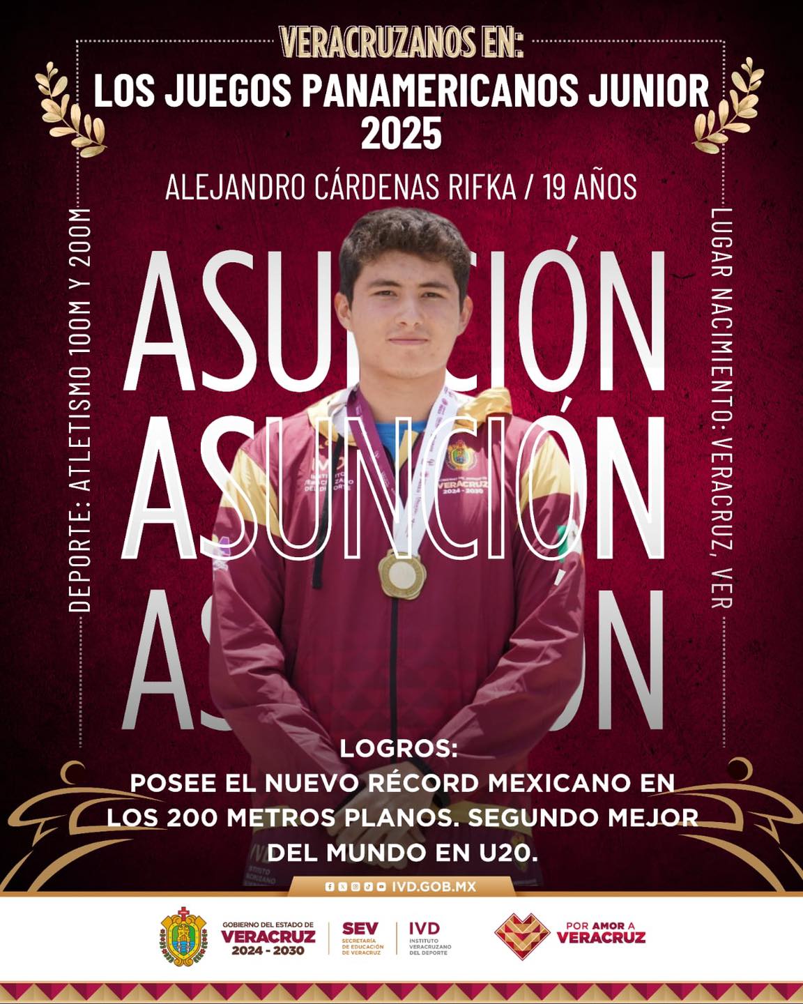 Alejandro Cárdenas Rifka, especialista en los 100 y 200 metros planos, una de las principales promesas del atletismo nacional. En la Copa Nuevo León 2025, registró 20.53 segundos en los 200 metros, marcando un nuevo récord mexicano juvenil y posicionándose como el segundo mejor del mundo en su categoría. También fue doble medallista de oro en los Nacionales CONADE 2025, competirá del 18 al 22 de agosto.