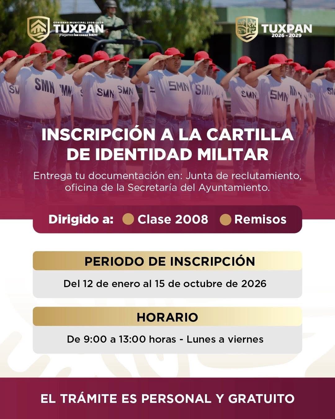 Tuxpan: Del 12 de enero al 15 de octubre de 2026 se llevará a cabo el proceso de inscripción para la Cartilla de Identidad Militar