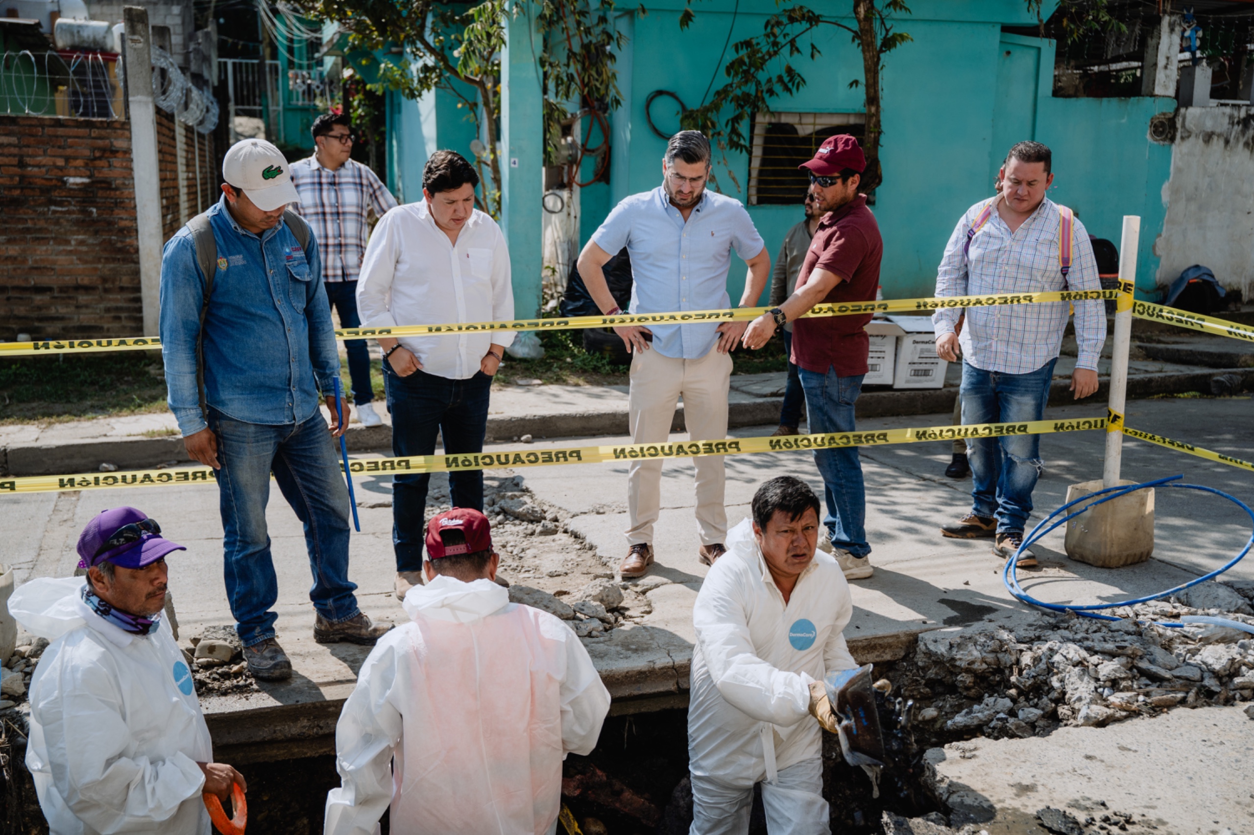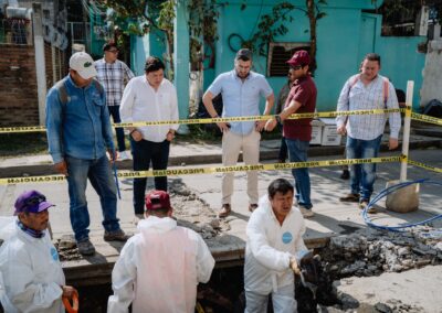 Durante la visita, el alcalde constató la dimensión de la cavidad y verificó los trabajos que ya se encuentran en proceso, los cuales incluyen la reparación de fuga de agua, desazolve, labores de bacheo y la conexión de una red hidráulica, con el objetivo de restablecer el suministro de agua y atender de manera integral las afectaciones.