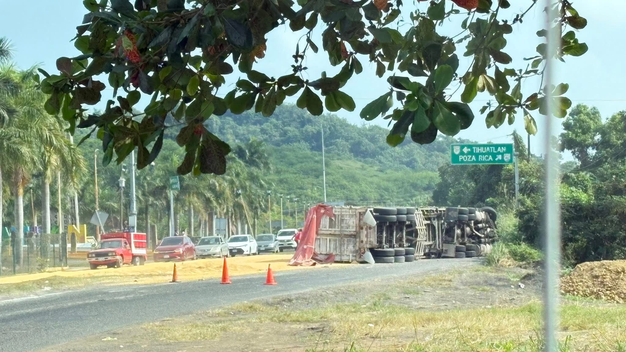 Tihuatlán, Veracruz | Un tráiler cargado con alimento para cerdo a granel volcó este miércoles sobre la carretera federal, a la altura del libramiento y en inmediaciones de la Unidad Deportiva, provocando un considerable congestionamiento vial en la zona.